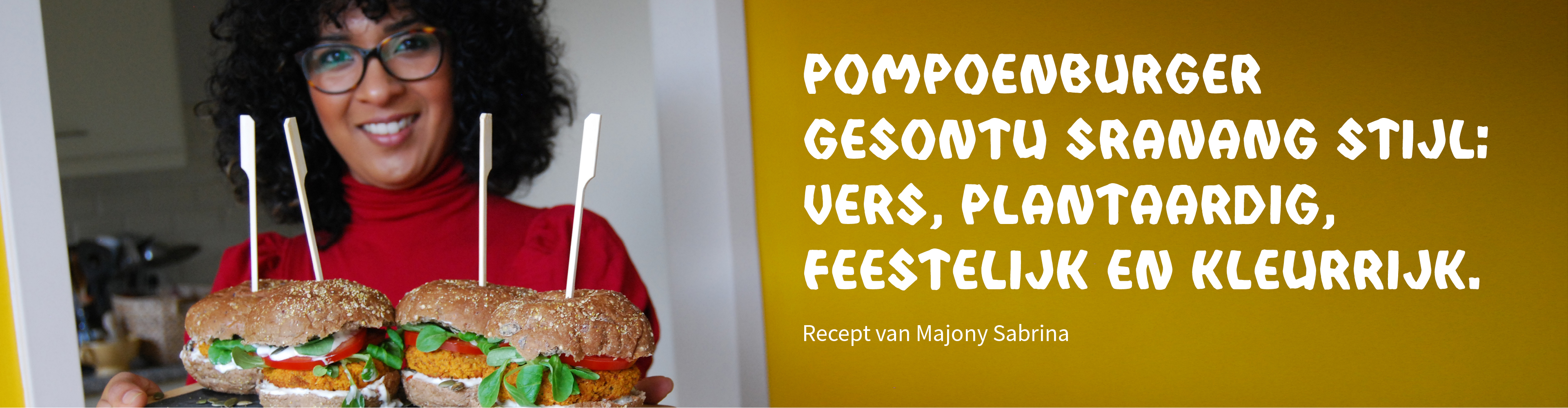 RECEPT - Odi mi gudu’s. Pompoen kennen we vooral als roti bijgerecht. Maar we kunnen er zo veel meer mee doen. Hier een smaakvol burgerrecept! Pompoen uit de oven op een broodje is heel lekker. Het is eenvoudig te maken, geloof me. Je hebt alleen wel wat gaartijd nodig, dus geduld is hier ook een hoofdingrediënt. Nyan switie, nyan Gesontu! Een recept van Majony Sabrina van Kitchen Business.